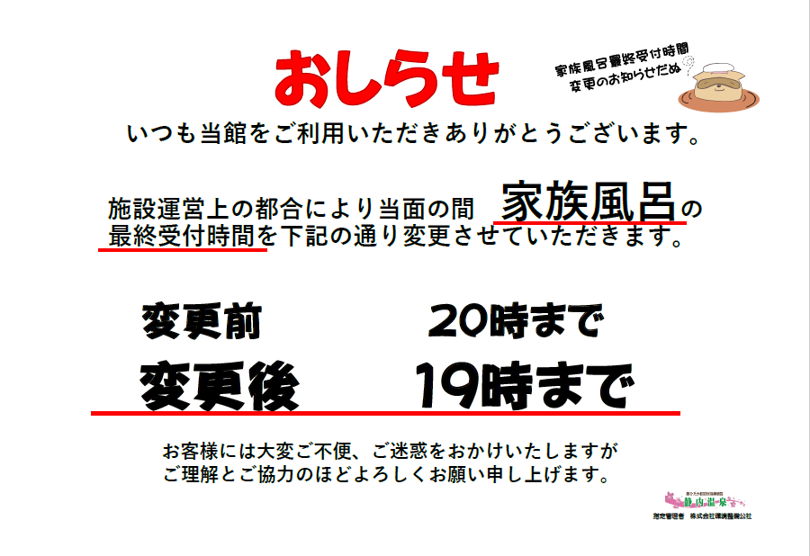 ♨家族風呂のご利用時間のご案内♨